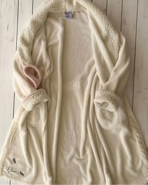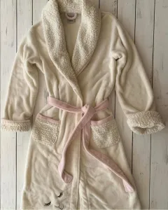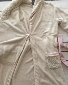 Talla: S/M, 100% poliéster, súper calientita y suave, mangas y cuello con detalle de borrego, la cinta rosa con la que se amarra viene pegada a la bata, por dentro trae un listón rosa para amarrar, medidas: 57 cm de axila, 52 cm de hombros, 118 cm de largo. Es beige con detalles rosa.