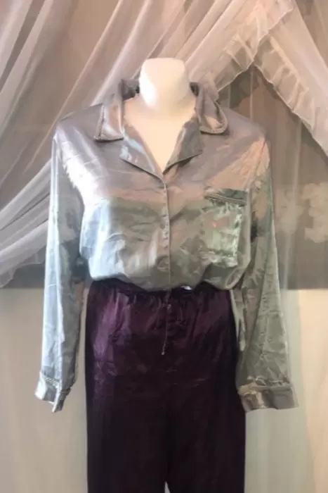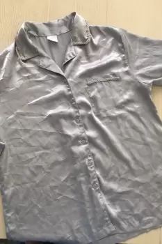 Camisa de pijama plata. Camisa de pijama plata, manga larga con botones al frente y bolsillos, trae detalle decoratico de tira trenzada en la orilla de cuello, bolsillo y mangas.Medidas:Hombro a hombro: 53 cmAxila a axila: 58 cmLargo: 70 cm