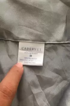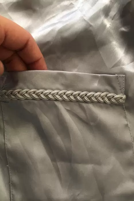 Camisa de pijama plata, manga larga con botones al frente y bolsillos, trae detalle decoratico de tira trenzada en la orilla de cuello, bolsillo y mangas.Medidas:Hombro a hombro: 53 cmAxila a axila: 58 cmLargo: 70 cm