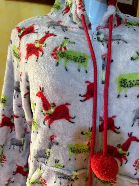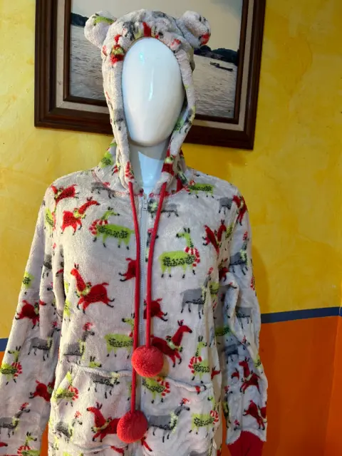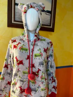 Mameluco para adulto, tela polar súper suave y calientita. Capucha con orejas y jaretas con motas, bies en las mangas con orificio para meter el dedo pulgar de la mano. Las medidas son: 39 cm de hombro a hombro, talle 53 cm sin estirar y tiro 63 cm