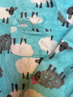 Una hermosa pijama polar delgado y calientito. Tiene detalles de bies azules y bolsa en el pecho. Las medidas son de blusa: 48 cm de hombro a hombro, talle 54 cm y pantalón: 41 cm de cintura, cadera 61 cm sin estirar y tiro 34 cm