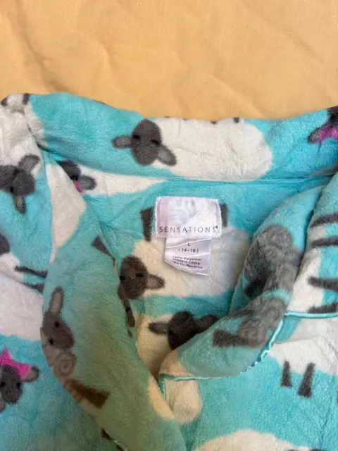 Pijama color azul de borreguito. Una hermosa pijama polar delgado y calientito. Tiene detalles de bies azules y bolsa en el pecho. Las medidas son de blusa: 48 cm de hombro a hombro, talle 54 cm y pantalón: 41 cm de cintura, cadera 61 cm sin estirar y tiro 34 cm