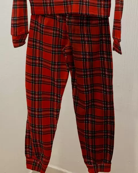 Pijama súper calientita de franela a cuadros en color rojo. La sudadera es L, el pantalón en M, pero queda bien a talla M.