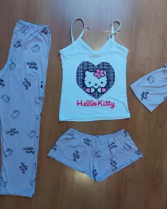 Bonito set de pijama de hello kitty. Es unitalla, viene con 4 piezas que incluye, short, pantalón, blusa y bolsita de tela para guardar pijama. Es nuevo sin etiqueta la tela es brush por lo tanto Es muy suave y fresca, perfecto para cualquier temporada y aquí contiene la opcion de elegir short o pantalón
