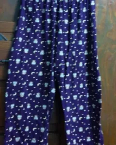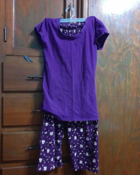 Fresca pijama morada, el estampado es de búhos, buen estado, ojo no es el juego original yo lo armé, pero ambas piezas estan en excelentes condiciones. Talla s