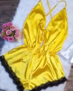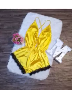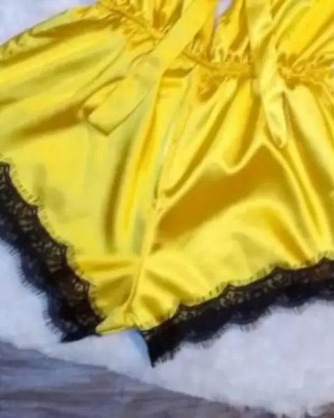 Hermosa pijama satinada con espalda descubierta, color amarillo intenso con short con encaje. Es muy sexy