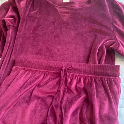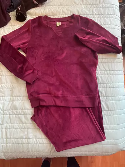 Piyama terciopelo tinto. Honeydew, puesta una vez talla XS. Sudadera: 49 pecho x 54 largo, pantalón 34 cintura (tiene resorte) 54 cadera x 93 largo. Tiene un poco de elastano, cómoda y calientita
