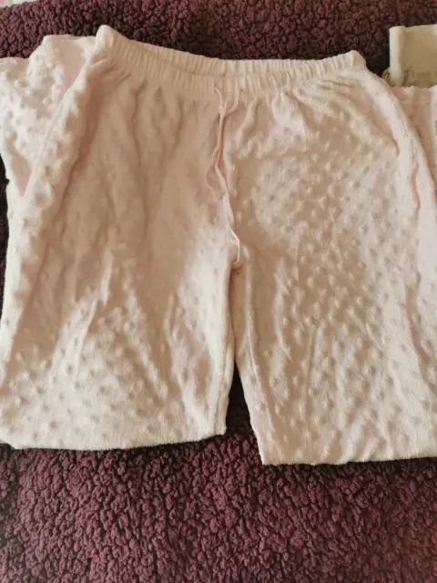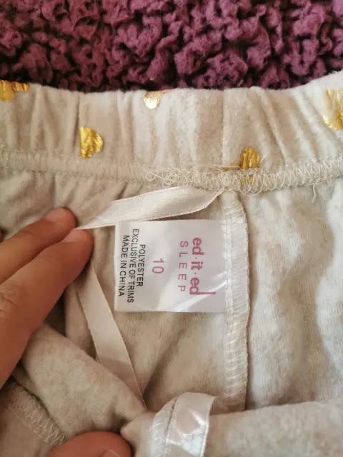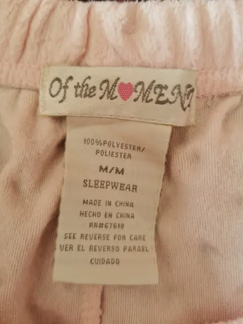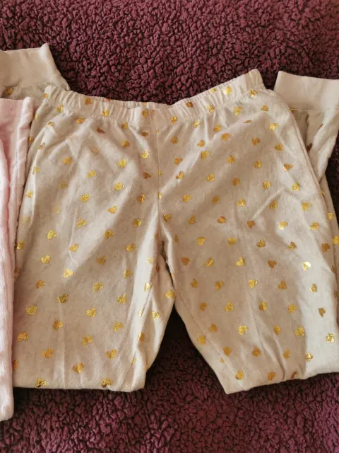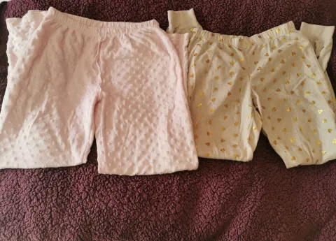 Pijamas calientitas quedan a S y M, son muy comodas, una es rosa bajito tipo deslavado y la otra beige con corazones algunos corazones estan desgastados más no hacer ver mal la prenda.