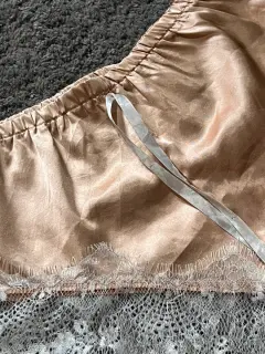 Precioso short para dormir. La tela es satinada color rosado dorado. Ligerita , sexy y muy cómoda. Súper bonita 😍 Tiene resortito en cintura. Medidas cintura 35 cm, largo 24 cm