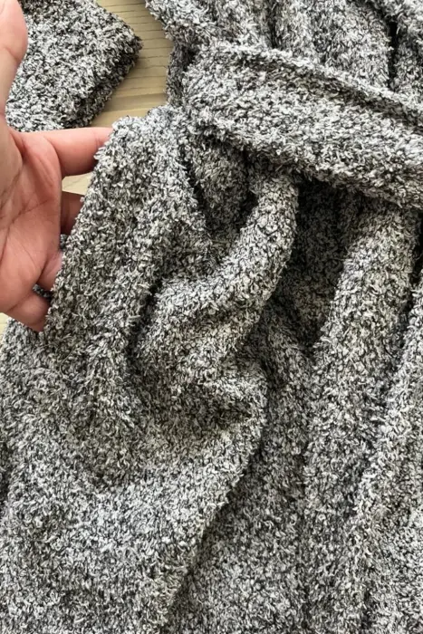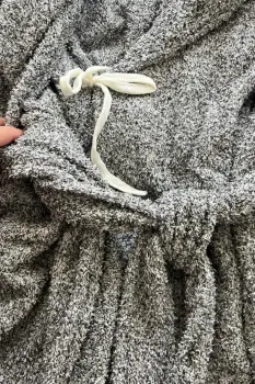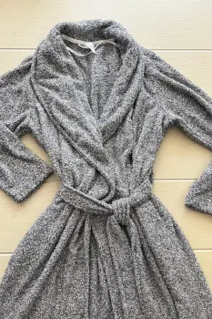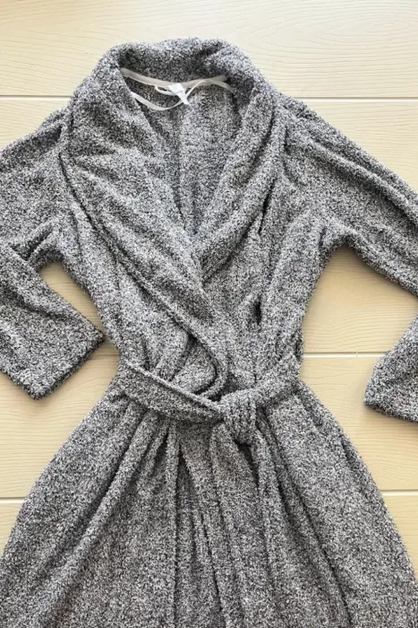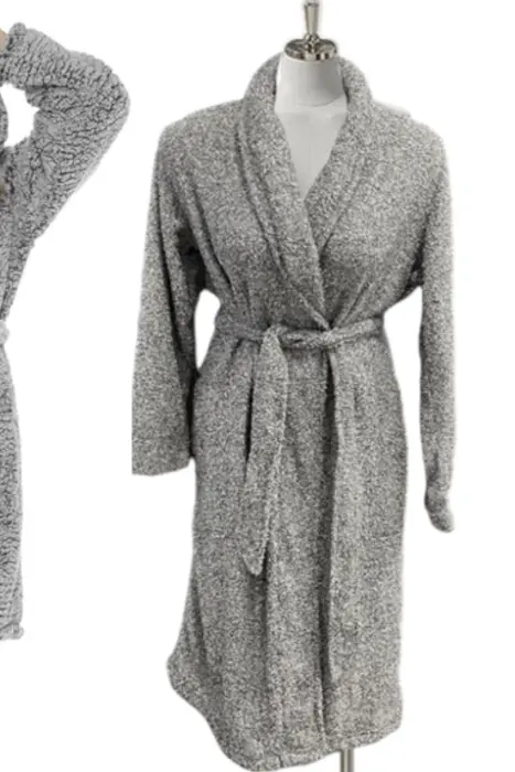 Sobre bata gris tela tipo borrego suave al tacto, viene con cinto para amarrar. Tono gris oscuro.Medidas:Hombro a hombro: 48 cmAxila a axila: 81 cmLargo: 12 cm