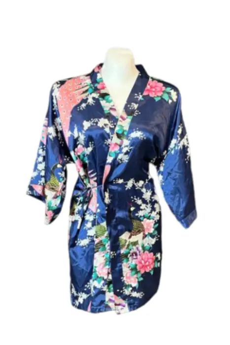 Sobre bata para dormir azul tela satinada el diseño es de flores en tonos rosa. Pieza unitalla checar medidas. No trae cinto para amarre.Medidas:Hombro a hombro: 70 cmAxila a axila: 68 cmLargo: 87 cm de hombro a raz de largo