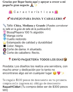 Características🛍 📌𝐌𝐀𝐍𝐄𝐉𝐎 𝐏𝐀𝐑𝐀 𝐃𝐀𝐌𝐀 𝐘 𝐂𝐀𝐁𝐀𝐋𝐋𝐄𝐑𝐎📌📏Talla: 𝐂𝐡𝐢𝐜𝐚, 𝐌𝐞𝐝𝐢𝐚𝐧𝐚 𝐲 𝐆𝐫𝐚𝐧𝐝𝐞 (𝘗𝘶𝘦𝘥𝘦𝘴 𝘤𝘰𝘳𝘳𝘰𝘣𝘰𝘳𝘢𝘳 𝘵𝘶 𝘵𝘢𝘭𝘭𝘦 𝘦𝘯 𝘭𝘢 𝘨𝘶í𝘢 𝘥𝘦 𝘵𝘢𝘭𝘭𝘢 𝘥𝘦 𝘭𝘢 𝘱𝘶𝘣𝘭𝘪𝘤𝘢𝘤𝘪ó𝘯)👚Blusa/Playera 100 % algodón👕Manga corta💎Cuello redondo⭐️Estampado de calidad y durabilidad◾️Color: Negro.🙋🏻♀️Corte de dama: A siluetado.🙋🏻♂️Corte de caballero: Recto. 📍𝗘𝗡𝗩Í𝗢 𝗣𝗔𝗤𝗨𝗘𝗧𝗘𝗥Í𝗔 𝗧𝗢𝗗𝗢𝗦 𝗟𝗢𝗦 𝗗𝗜𝗔𝗦🚚📦 Posdata: Los diseños los realiza una servidora, con mucho amor y dedicación por lo tanto no encontraras algo así en cualquier lugar ☺️💖✨𝐆𝐫𝐚𝐜𝐢𝐚𝐬 𝐩𝐨𝐫 𝐥𝐥𝐞𝐠𝐚𝐫 𝐡𝐚𝐬𝐭𝐚 𝐚𝐪𝐮í 𝐲 𝐚𝐩𝐨𝐲𝐚𝐫 𝐚 𝐜𝐫𝐞𝐜𝐞𝐫 𝐚 𝐦𝐢 𝐩𝐞𝐪𝐮𝐞ñ𝐨 𝐠𝐫𝐚𝐧 𝐧𝐞𝐠𝐨𝐜𝐢𝐨 🙏🏾✨