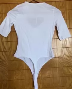 Body con hermoso cruce de trenza con delgadas cintas de la misma tela en delicado escote delantero superior. Fashion, practico y fresco, Tanga-Hilo en la parte trasera inferior, con broches ajustales. En perfecto estado. Talla XS tambien queda a S, la tela estira considerablemente. Medidas: Axilas 42ctm, cintura 38ctm.