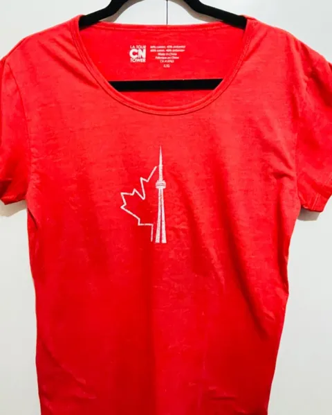Camisa roja, cuello redondo, manda corta, con insignia de la flor de maple de Canadá. Nueva