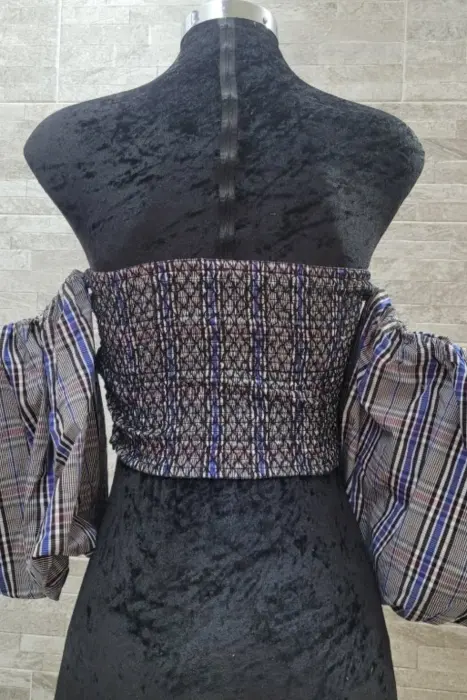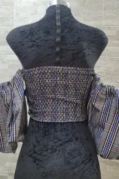 Crop top off shoulder, estampado a cuadros, mangas abullonadas, cierre invisible lateral, elástico en la espalda..📐Medidas: Largo 25 cm; busto 92 cm🩱Talla: M (28)🌸Tela: Algodón y poliéster⭐Estado: Excelente.Envío un día después de tu compra