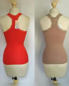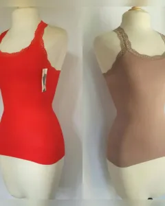 PAQUETE dos tank top colores ROJO FUEGO/TOPO c/ribete de encaje enfrente y espalda, corte tirantes tipo sport y CONTROL POWER en zona de abdomen que dan un soporte extraordinario y genera un lindo delineado. UNITALLA (da a S/M). Dimensiones cms (SIN ESTIRAR): ROJO 32 axila, 27 cintura, 32 zona baja, 49 largo. TOPO 31 axila, 27 cintura, 31 zona baja, 48 largo. 92% nylon, 8% elastano. P/lavado casa.
