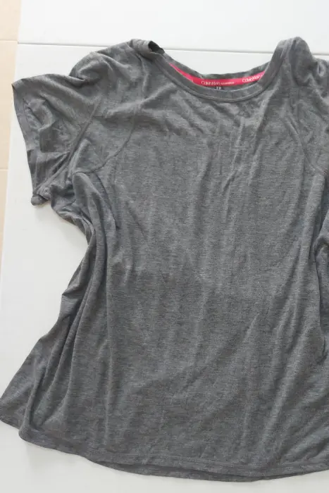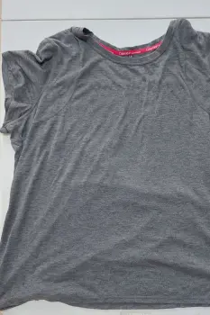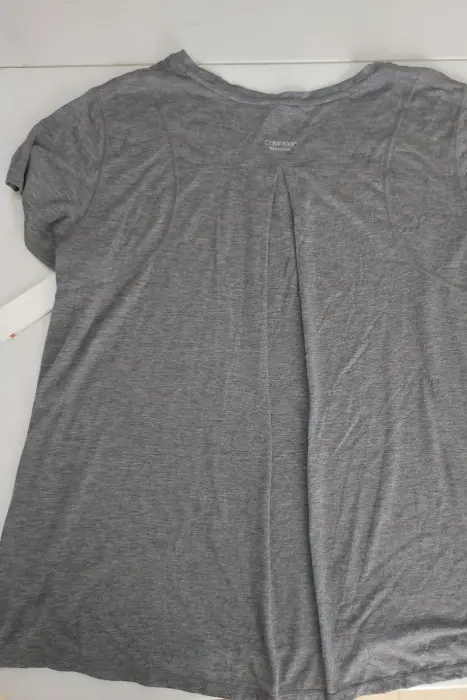 Playera gris, manga corta, con pinza en parte trasera, corte amplioTela Poliester, rayón