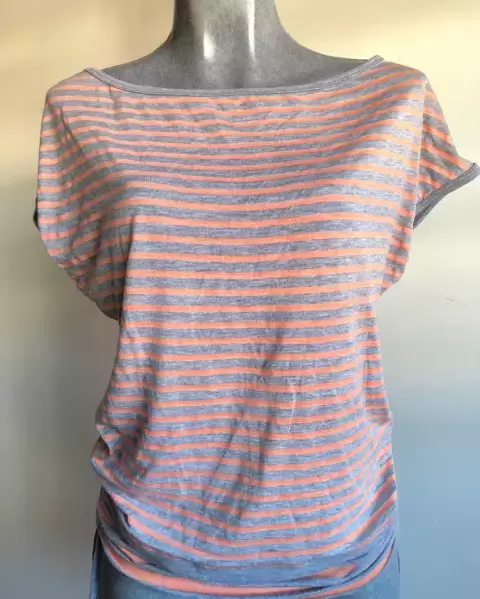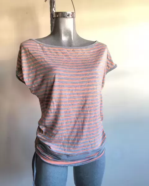 PLAYERA A RAYAS. HERMOSA PLAYERA A RAYAS (SALMON&GRIS) CON JARETA EN AMBOS COSTADOS A LA ALTURA DE LA CINTURA. ENVÍO PRENDA SANITIZADA. USO MATERIAL RECICLADO, GRACIAS POR TU COMPRENSIÓN.