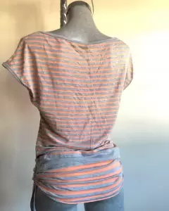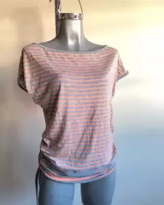 HERMOSA PLAYERA A RAYAS (SALMON&GRIS) CON JARETA EN AMBOS COSTADOS A LA ALTURA DE LA CINTURA. ENVÍO PRENDA SANITIZADA. USO MATERIAL RECICLADO, GRACIAS POR TU COMPRENSIÓN.