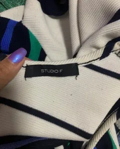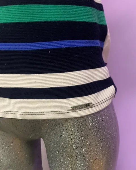 Preciosa playera a rayas, marca STUDIO F. Es talla XS pero también le va a una chica.Sus medidas son: 57cm de largo, 43cm de axila a axila y 39cm de hombro a hombro.