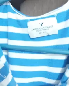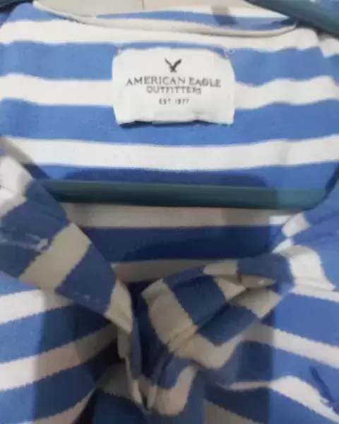 Playera American Eagle con cuello es rayada azul con blanco,pu⁸ede convinarla con cualquier prenda de un solo color obscuro es talla xs puede quedar S y M, yo soy M.