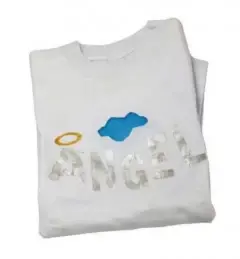 Playera blanca tiene un puntito al frente como detalle, tiene con la palabra ángel y una nube en el frente es vinil planchado, en la parte de atrás tiene dos alas calada que deja al descubierto la espalda. Muy linda y única
