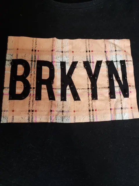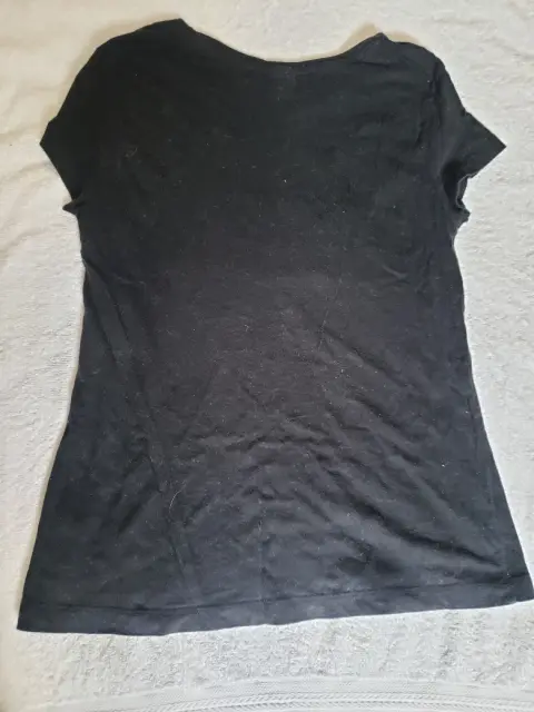 Playera de media vida, con rastros de desgaste en el estampado, color un poco desvanecido y cuello redondo, tela en buen estado.