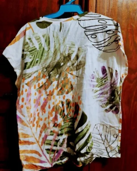 Nueva, de la línea Emery Rose. Talla s , pero queda amplia camiseta de manga murciélago con estampado tropical con perro. Hombro 56, pecho 106 cm, largo 61.3, largo de manga 19.2 cm
