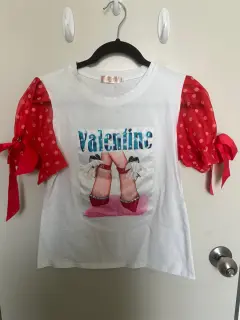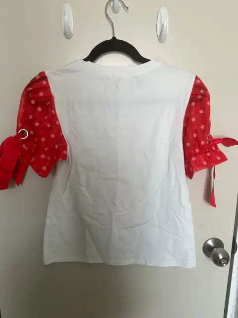 Hermosa playera de algodón con licra muy coqueta con mangas rojas y detalle de moños, amolda muy bonito talla S queda bien hasta una talla mediana.