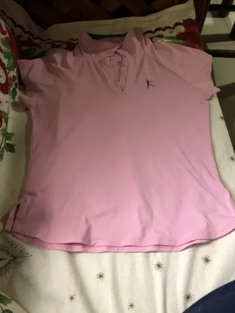 Playera Deportiva Danskin color Rosa en Lycra, talla grande con cuello V y líneas Azul y negra en este, manga corta.