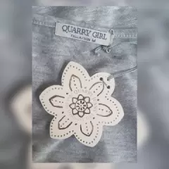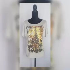 Playera Estampada Cola de Pato. Playera cola de pato color GRIS SIBERIA c/estampado MULTICOLOR c/aplique bisutería translúcida diseño Torre Eiffel, cuello redondo, manga corta. Talla M. Dimensiones cms: 49 hombro, 60 axila, 57 zona baja, 59 largo delantero, 67 largo trasero, 17 largo manga. 100% viscosa. Para lavado en casa.