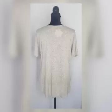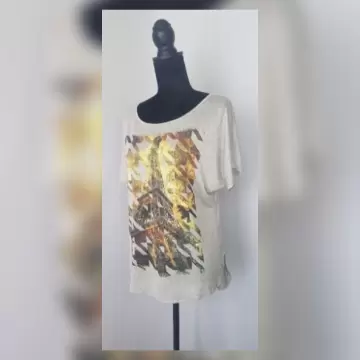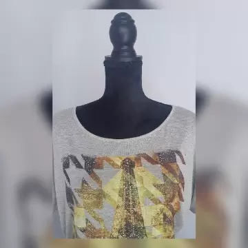 Playera cola de pato color GRIS SIBERIA c/estampado MULTICOLOR c/aplique bisutería translúcida diseño Torre Eiffel, cuello redondo, manga corta. Talla M. Dimensiones cms: 49 hombro, 60 axila, 57 zona baja, 59 largo delantero, 67 largo trasero, 17 largo manga. 100% viscosa. Para lavado en casa.