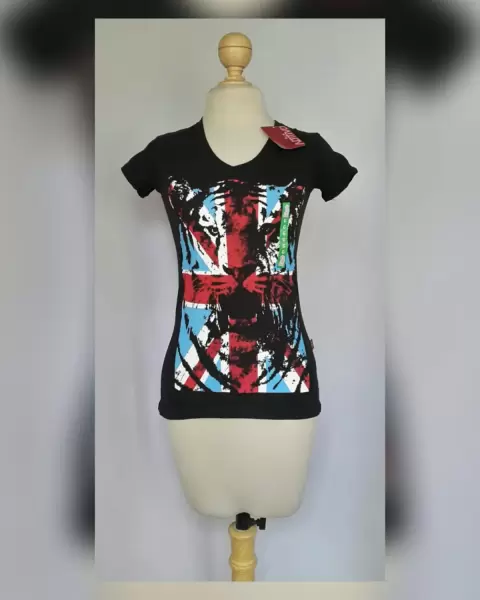 Playera estilo T-Shirt en color NEGRO ÉBANO c/estampado delantero tigre y bandera británica multicolor, cuello pico y manga corta. Por la composición de la tela es stretch. Talla G (REDUCIDA, da mejor a M). Dimensiones cms: 35 hombro, 43 axila, 39 cintura, 46 zona baja, 61 largo, 12 largo manga. 95% algodón, 5% elastano. P/lavado en casa.
