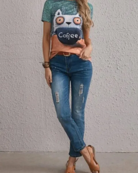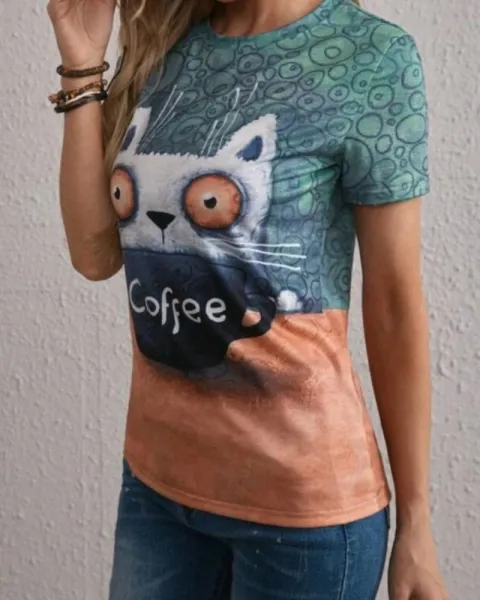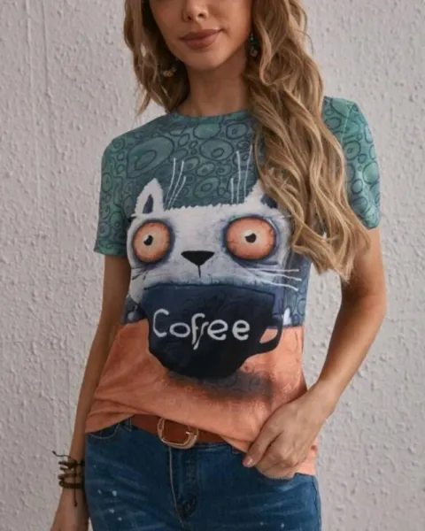 Playera estampada Gato. Playera estampada GatoMarca Shein, viene amplia, nueva, talla S. Material poliéster. Hombro 39 cm, pecho 94 cm, largo 62.5 cm, largo de manga 17.5 puño 30 cm