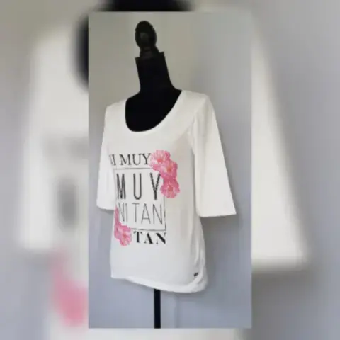 Playera estilo Dolman Sleeve. Playera estilo dolman sleeve en color BLANCO POLAR, modelo "Ni muy muy ni tan tan" c/estampado delantero en tonos NEGRO/ROSA, cuello joya y manga 3/4. Por la composición de la tela es stretch. Talla G. Dimensiones cms: 39 hombro, 45 axila, 44 cintura, 48 zona baja, 56 largo, 36 largo manga. 100% algodón. P/lavado en casa.***Esta marca maneja prendas de extraordinaria calidad, su algodón es orgánico y soporta ciclos de lavado en máquina sin problemas, no se deslavan los estampados y las telas salen casi sin arrugas.***El corte de la playera es évase***