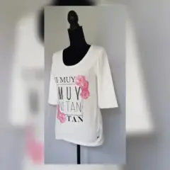 Playera estilo dolman sleeve en color BLANCO POLAR, modelo "Ni muy muy ni tan tan" c/estampado delantero en tonos NEGRO/ROSA, cuello joya y manga 3/4. Por la composición de la tela es stretch. Talla G. Dimensiones cms: 39 hombro, 45 axila, 44 cintura, 48 zona baja, 56 largo, 36 largo manga. 100% algodón. P/lavado en casa.***Esta marca maneja prendas de extraordinaria calidad, su algodón es orgánico y soporta ciclos de lavado en máquina sin problemas, no se deslavan los estampados y las telas salen casi sin arrugas.***El corte de la playera es évase***