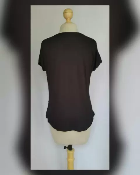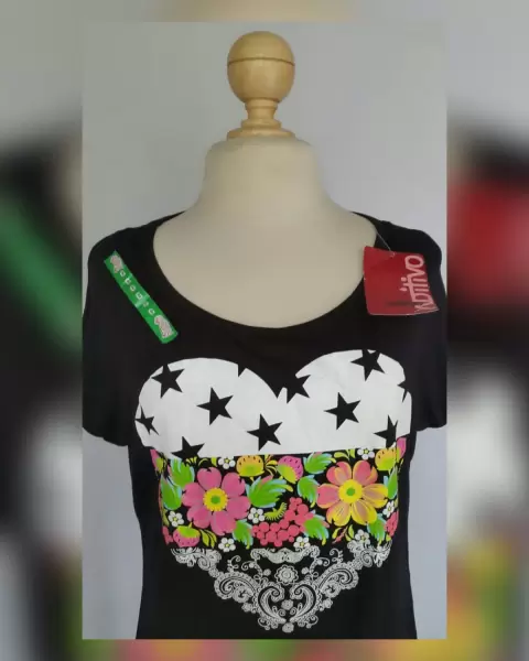 Playera estilo Girly. Playera estilo Girly en color NEGRO ÉBANO c/estampado corazón multicolor, cuello joya y manga corta. P/la composición de la tela es stretch. Talla G. Dimensiones cms: 45 hombro, 57 axila, 50 cintura, 56 zona baja, 64 largo, 11 largo manga. 100% rayón. Para lavado en casa.