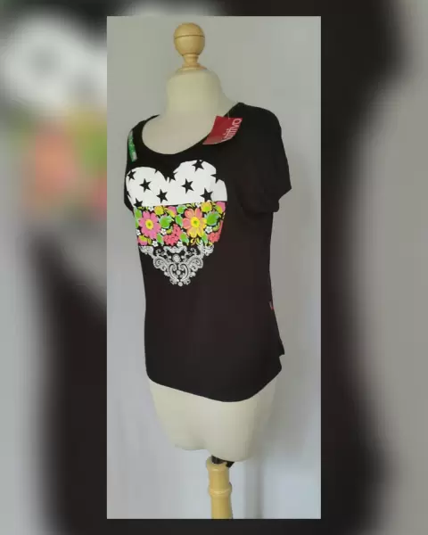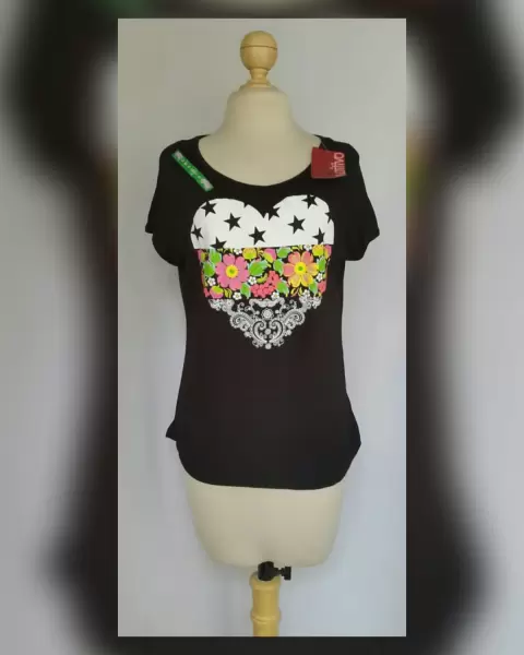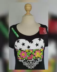 Playera estilo Girly en color NEGRO ÉBANO c/estampado corazón multicolor, cuello joya y manga corta. P/la composición de la tela es stretch. Talla G. Dimensiones cms: 45 hombro, 57 axila, 50 cintura, 56 zona baja, 64 largo, 11 largo manga. 100% rayón. Para lavado en casa.