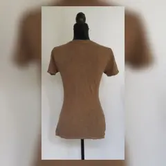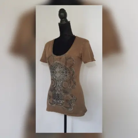 Playera estilo T-Shirt en color CAFÉ ALETILLA efecto deslavado, modelo "Calakex" c/estampado delantero en tonos NEGRO/BLANCO LINO, cuello joya y manga corta. Por la composición de la tela es stretch. Talla G (REDUCIDA, da mejor a M). Dimensiones cms: 39 hombro, 43 axila, 38 cintura, 45 zona baja, 56 largo, 15 largo manga. 100% algodón. P/lavado en casa.***El efecto deslavado de la prenda es muy lindo y no lo capta la fotografía***Esta marca maneja prendas de extraordinaria calidad, su algodón es orgánico y soporta ciclos de lavado en máquina sin problemas, no se deslavan los estampados y las telas salen casi sin arrugas.***