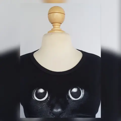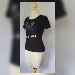 Playera estilo T-Shirt mod Cat o Holic. Playera estilo T-Shirt en color NEGRO ÉBANO modelo "Cat o holic" c/estampado delantero en tono BLANCO LINO, cuello redondo y manga corta. Por la composición de la tela es stretch. Talla G. Dimensiones cms: 41 hombro, 49 axila, 42 cintura, 48 zona baja, 56 largo, 15 largo manga. 95% algodón, 5% elastano. P/lavado en casa.***Esta marca maneja prendas de extraordinaria calidad, su algodón es orgánico y soporta ciclos de lavado en máquina sin problemas, no se deslavan los estampados y las telas salen casi sin arrugas.***