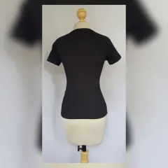 Playera estilo T-Shirt en color NEGRO ÉBANO modelo "Cat o holic" c/estampado delantero en tono BLANCO LINO, cuello redondo y manga corta. Por la composición de la tela es stretch. Talla G. Dimensiones cms: 41 hombro, 49 axila, 42 cintura, 48 zona baja, 56 largo, 15 largo manga. 95% algodón, 5% elastano. P/lavado en casa.***Esta marca maneja prendas de extraordinaria calidad, su algodón es orgánico y soporta ciclos de lavado en máquina sin problemas, no se deslavan los estampados y las telas salen casi sin arrugas.***