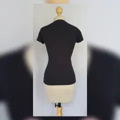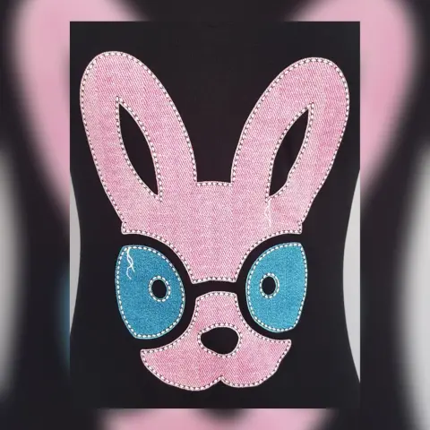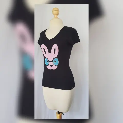 Playera estilo T-Shirt en color NEGRO ÉBANO modelo "Conejín" con estampado delantero en tonos BLANCO, ROSA Y AZUL, cuello pico y manga corta. Por la composición de la tela es stretch. Talla G. Dimensiones cms: 41 hombro, 43 axila, 37 cintura, 45 zona baja, 59.5 largo, 9.5 largo manga. 95% algodón, 5% elastano. P/lavado en casa.***Esta marca maneja prendas de extraordinaria calidad, su algodón es orgánico y soporta ciclos de lavado en máquina sin problemas, no se deslavan los estampados y las telas salen casi sin arrugas.***