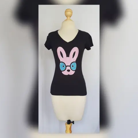 Playera estilo T-Shirt mod Conejín. Playera estilo T-Shirt en color NEGRO ÉBANO modelo "Conejín" con estampado delantero en tonos BLANCO, ROSA Y AZUL, cuello pico y manga corta. Por la composición de la tela es stretch. Talla G. Dimensiones cms: 41 hombro, 43 axila, 37 cintura, 45 zona baja, 59.5 largo, 9.5 largo manga. 95% algodón, 5% elastano. P/lavado en casa.***Esta marca maneja prendas de extraordinaria calidad, su algodón es orgánico y soporta ciclos de lavado en máquina sin problemas, no se deslavan los estampados y las telas salen casi sin arrugas.***