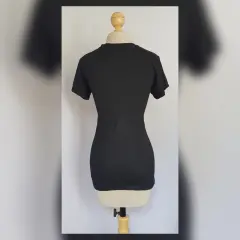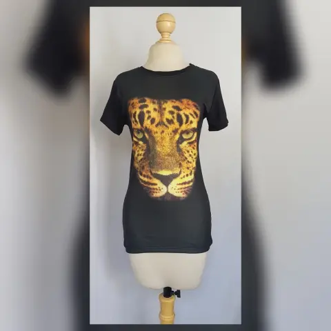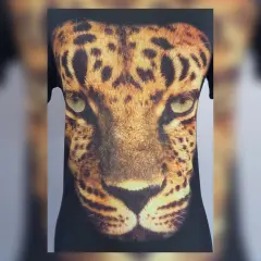 Playera estilo T-Shirt mod Jaguar. Playera estilo T-Shirt bitono NEGRO/GRIS PIZARRA modelo "Jaguar" cestampado delantero MULTICOLOR, cuello redondo y manga corta. Por la composición de la tela es stretch. Talla EG (REDUCIDA, da mejor a G). Dimensiones cms: 41 hombro, 45 axila, 41 cintura, 46 zona baja, 68 largo, 16 largo manga. 50% algodón, 50% poliéster. P/lavado en casa.