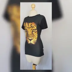 Playera estilo T-Shirt bitono NEGRO/GRIS PIZARRA modelo "Jaguar" cestampado delantero MULTICOLOR, cuello redondo y manga corta. Por la composición de la tela es stretch. Talla EG (REDUCIDA, da mejor a G). Dimensiones cms: 41 hombro, 45 axila, 41 cintura, 46 zona baja, 68 largo, 16 largo manga. 50% algodón, 50% poliéster. P/lavado en casa.