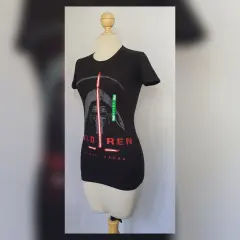 Playera estilo T-Shirt en color NEGRO ÉBANO modelo "Kylo Ren" c/estampado delantero MULTICOLOR, cuello redondo y manga corta. Por la composición de la tela es stretch. Talla G (REDUCIDA, da mejor a M). Dimensiones cms: 34 hombro, 45 axila, 41 cintura, 46 zona baja, 63 largo, 15 largo manga. 95% algodón, 5% elastano. P/lavado en casa.