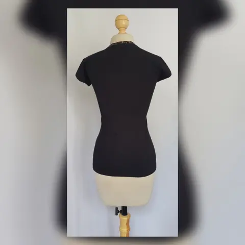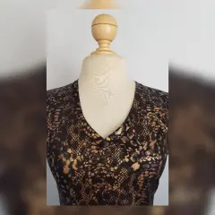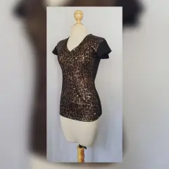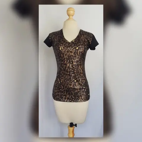 Playera estilo T-Shirt en color NEGRO ÉBANO modelo "Markis Dora" c/estampado animal print en tono DORADO, cuello pico y manga corta. Por la composición de la tela es stretch. Talla G. Dimensiones cms: 41 hombro, 46 axila, 39 cintura, 48 zona baja, 64 largo, 9 largo manga. 95% algodón, 5% elastano. P/lavado en casa.***Esta marca maneja prendas de extraordinaria calidad, su algodón es orgánico y soporta ciclos de lavado en máquina sin problemas, no se deslavan los estampados y las telas salen casi sin arrugas.***