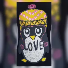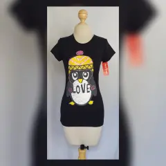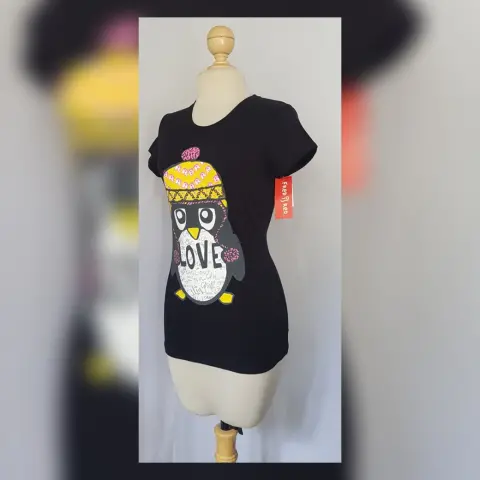Playera estilo T-Shirt en color NEGRO ÉBANO modelo "Penguin Love" c/estampado delantero en tono MULTICOLOR, cuello redondo y manga corta. Por la composición de la tela es stretch. Talla G. Dimensiones cms: 36 hombro, 47 axila, 40 cintura, 47 zona baja, 64 largo, 12 largo manga. 91% algodón, 9% elastano. P/lavado en casa.