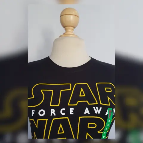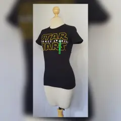 Playera estilo T-Shirt en color NEGRO ÉBANO modelo "Star Wars" c/estampado delantero AMARILLO MANGO/BLANCO POLAR, cuello redondo y manga corta. Por la composición de la tela es stretch. Talla G (REDUCIDA, da mejor a M). Dimensiones cms: 33 hombro, 45 axila, 41 cintura, 46 zona baja, 60 largo, 15 largo manga. 95% algodón, 5% elastano. P/lavado en casa.