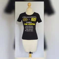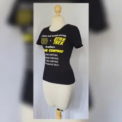 Playera estilo T-Shrit mod Star Contigo. Playera estilo T-Shirt en color NEGRO ÉBANO modelo "Star Contigo" con estampado delantero en tonos BLANCO POLAR y AMARILLO, cuello redondo y manga corta. Por la composición de la tela es stretch. Talla G. Dimensiones cms: 42 hombro, 49 axila, 40 cintura, 46 zona baja, 57 largo, 14.5 largo manga. 95% algodón, 5% elastano. P/lavado en casa.***Esta marca maneja prendas de extraordinaria calidad, su algodón es orgánico y soporta ciclos de lavado en máquina sin problemas, no se deslavan los estampados y las telas salen casi sin arrugas.***
